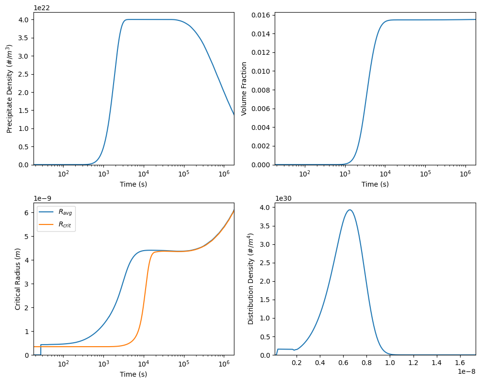 We can now plot the results. Here, we are plotting the precipitate density, volume fraction and average radius as a function of time and the size distribution density at the final time.