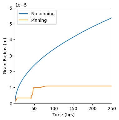 65 plotRadiusvsTime(grainModel, ax=ax, timeUnits='h', label='Pinning')
