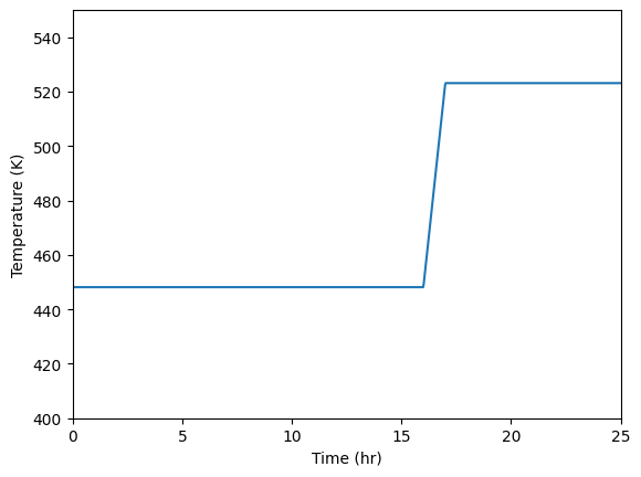 The temperature will be divided into two stages: a 16 hour temper at $175\text{ }^oC$, followed by a 1 hour ramp up to $250 ^oC$. To do this, there needs to be three time designations: $175\text{ }^oC$ at 0 hours, $175\text{ }^oC$ at 16 hours and $250\text{ }^oC$ at 17 hours. The temperature can be plotted to show the profile over time.