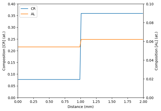 Along with precipitation, kawin also supports one dimensional diffusion models. In this example, a diffusion couple will be simulated between two different NiCrAl compositions. Both phases will be FCC.