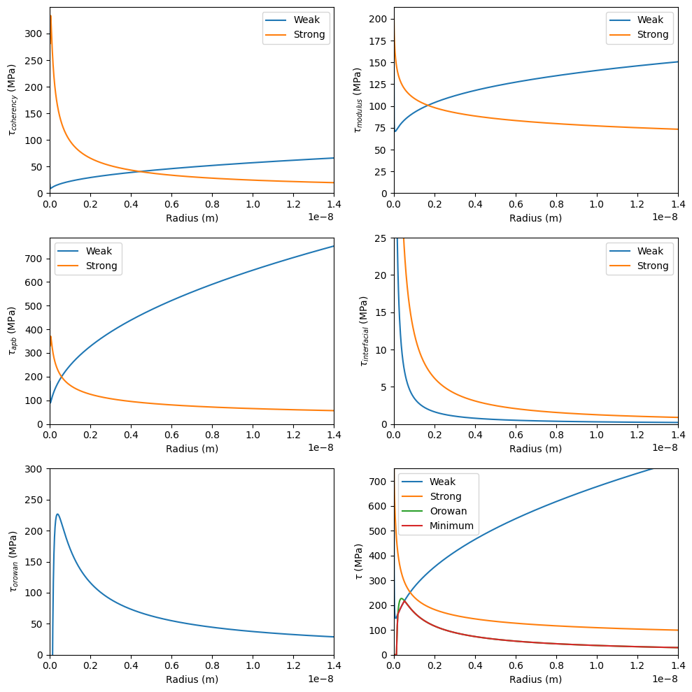 Plotting the strengthening models can be done as a function of the particle radius or a function of time (if a solved precipitate model is supplied). For plotting over radius, the mean projected radius and inter-particle distance are needed.