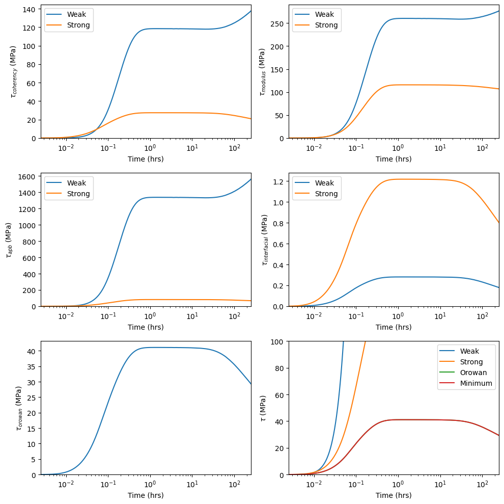 61 from kawin.precipitation.coupling import plotContributionOverTime, plotPrecipitateStrengthOverTime