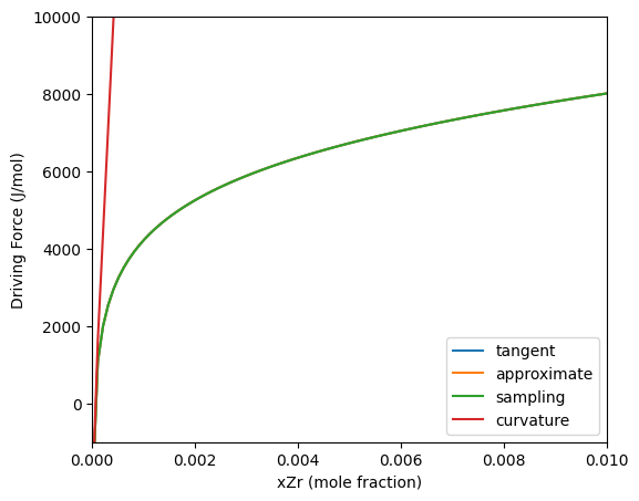 The example below compares the three methods on the Al-Zr system. The approximate and sampling method gives the same values for the driving force. This is due to the $Al_3Zr$ having zero degrees of freedom for the composition, so the calculation of the driving force ends up being the same. The curvature method is only accurate near the equilibrium composition (where the driving force is 0), but at higher concentrations, it greatly over predicts the driving force. This is due to the high curvature at low concentrations.
