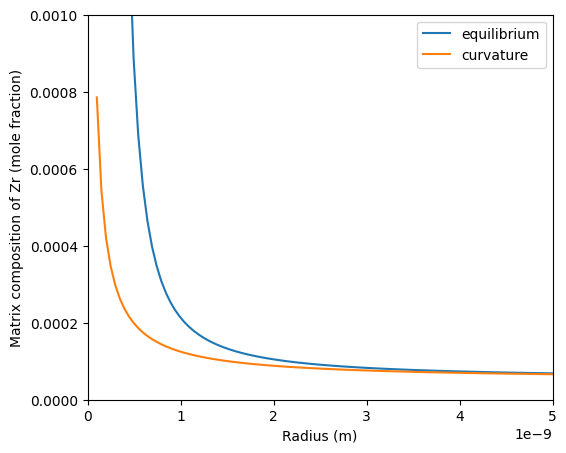 Where $G_{TH}$ is the free energy contribution from the Gibbs-Thomson effect. The example below compares the two methods for calculating the interfacial composition in the matrix phase. If $G_{TH}$ is too large such that the precipitate phase becomes unstable, then the function will return -1 for both the matrix and precipitate compostion.